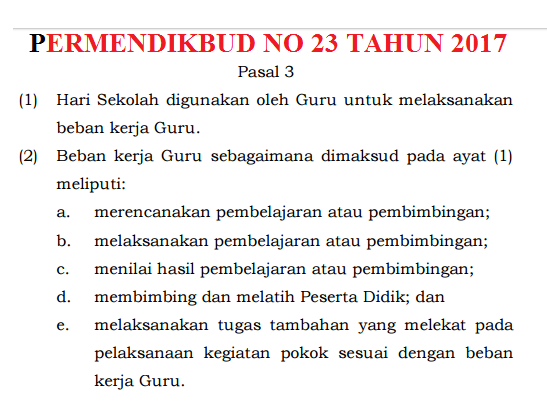 | Sesuai Permendikbud No 23 Tahun 2017 Tentang Hari Sekolah, 40 jam kerja bagi guru berlaku juga bagi sekolah yang belum menerapkan 5 hari kerja |